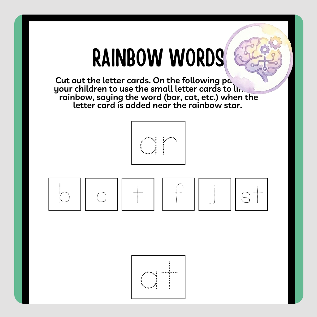 Brighten up literacy practice with this engaging Rainbow Words activity. Children use small letter cards to build words like bar or cat near a rainbow star, which helps them connect individual sounds to form full words. This resource encourages children to say each word aloud as they add new letters, building their phonics confidence and fine motor strength through cutting and handling the cards.